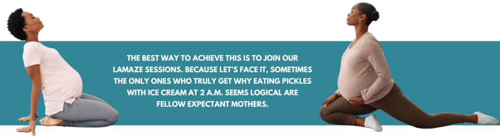Many moms also find community in prenatal exercise classes. Sharing a room with others who understand the struggles of swollen ankles and midnight cravings creates bonds and laughter. The best way to achieve this is to join our Lamaze sessions. Because let’s face it, sometimes the only ones who truly get why eating pickles with ice cream at 2 a.m. seems logical are fellow expectant mothers.