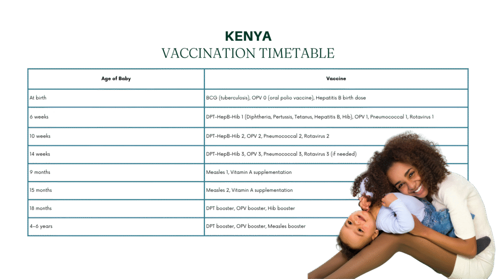From the very first days, your baby will begin a journey of protection. Here’s the Kenya vaccination timetable for newborns and young children, which shows what vaccines are given and when: